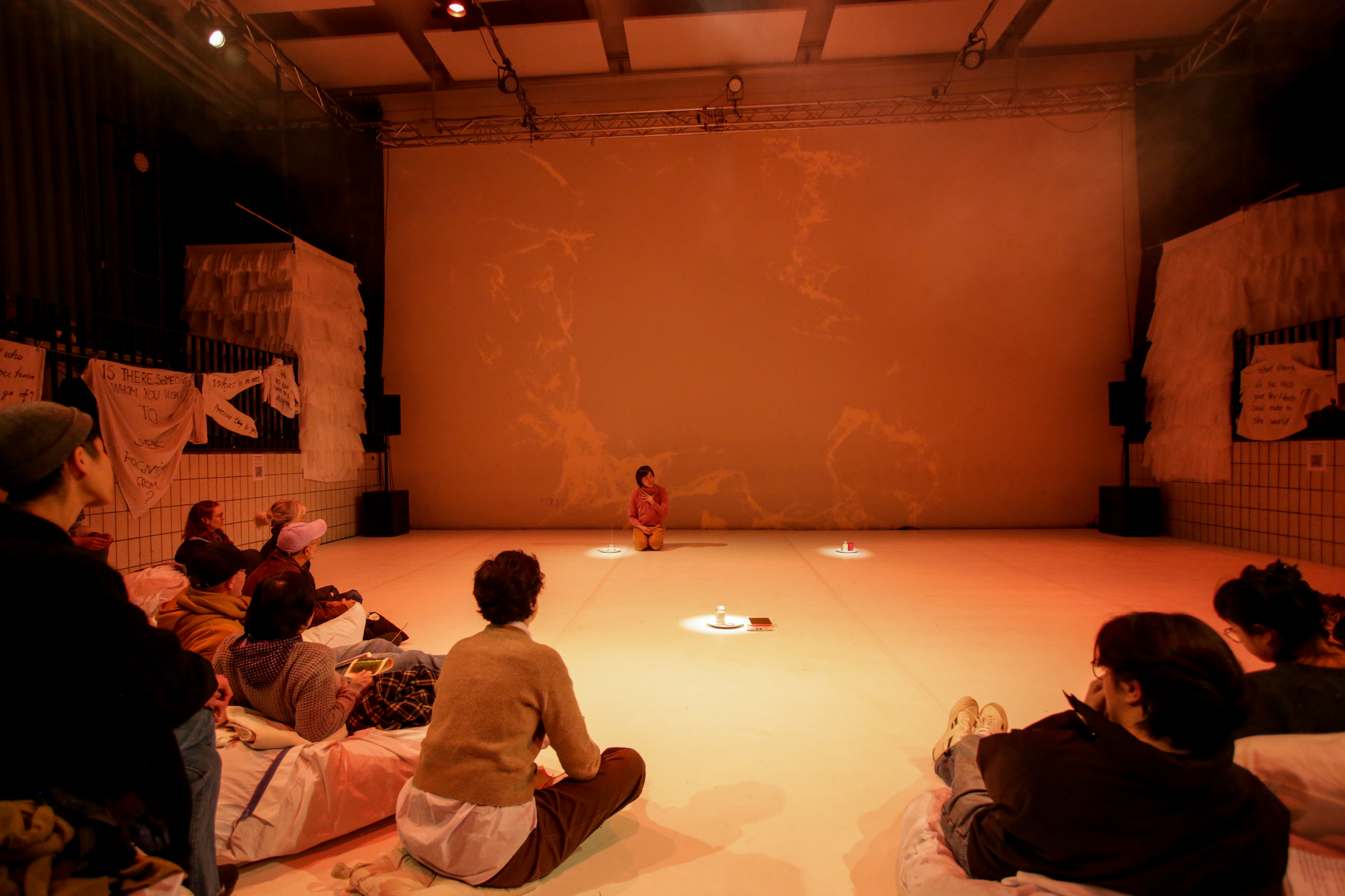 Before Lee’s show, death doula Alessa Rhode delivers a comprehensive briefing in both German and English on content triggers and sensory stimuli. A retreat room is made available. Earplugs and sensory rings are provided. We are mentally, and quite literally, cushioned and thoughtfully guided into exploring a topic that requires care and sensitivity.